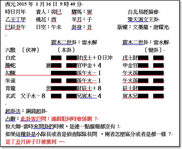 坦白說,常見應期占卦理中,這一卦剛好卡在占卜後只有1月24日一個子日,在過去2月5日已經交寅月了。但您幾乎不可能想到這麼深,所以在常見卦理中,我留給事前斷子日的老師一%的比例,因為那得真懂應期占卦理。至於事後的,都只事在幾個可能中猜一個罷了!