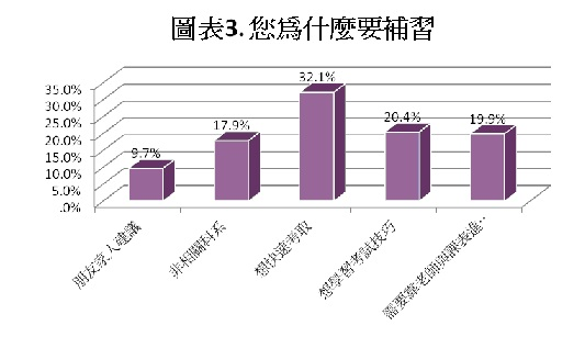 若詢問榜首們選擇補習的原因 (圖表3),32.1%的人是為了「想快速考取」,其次分別為「想學習考試技巧」(20.4%)、「需要靠老師與課表進度督促念書」 (19.9%),而因報考類科與學校所學無關的「非相關科系」,則佔了17.9%,這些可能和補習班有系統地講授、整理科目內容、答題技巧,提供模擬考的訓練機會有關。