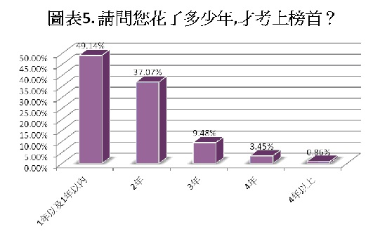 另外,對照「您花多少年,才考上榜首」提問(圖表5),一年及一年以內的佔了49.14%,一年以上到兩年的為37.07%,如此看來考上榜首,高達86.21%花了2年(含)以內的時間。