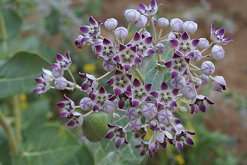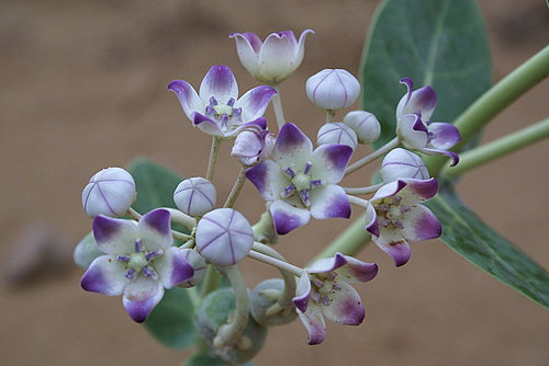 北印度金三角的旅行中,不論是在房屋旁的空地、牆角,或是在往德里、阿格拉及捷普的路途中,都會看到這種植物。在曼德瓦沙漠騎乘駱駝時,再次看到它的倩影,曼達瓦是一個沙漠小鎮,周遭滿佈著砂礫土丘,在惡劣的環境之下依然開出令人驚艷的花朵。當日晚餐過後一陣狂沙,然後又一陣大雨,早早就在房內休息。隔日清晨我快步離開住宿的古堡,找尋那不知名的花草,沒想到經過一夜的風雨,一樣清新自然的令人喜愛!
