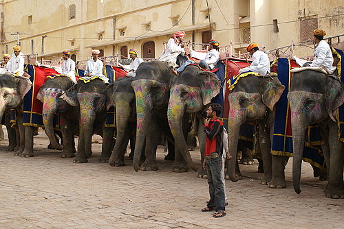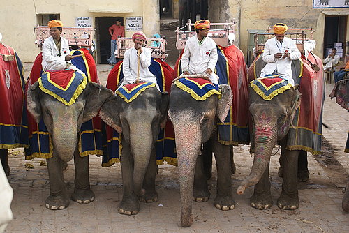旅遊琥珀堡時有一段爬坡路段,我們的交通工具是騎乘大象,對我而言也是新體驗。看到一整排的大象計程車真是很新鮮,騎乘大象比騎乘駱駝還不舒服,一路上搖搖晃晃上琥珀堡,只見路上都是一坨坨大象的黃金,在象背上拍照太有難度了。象夫與大象的工作目前都受到保障,以前因為遊客太多,大象過度勞累情緒失控,遊客曾經被摔落受傷,現在的大象工作時數已經受到限制了,倒是象夫會利用各種藉口向遊客多索取原先說好的價錢!
