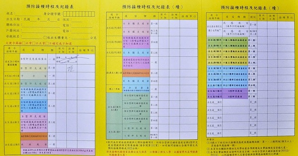 因為表格上需要有過去的注射紀錄,也就是嬰兒時期打疫苗時會拿的黃卡(如下圖),或是國小時學校健康檢查的注射紀錄(我的是一張綠色A4的紙,有小一到小六每次的健康檢查資料)