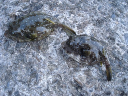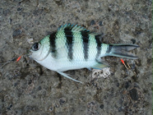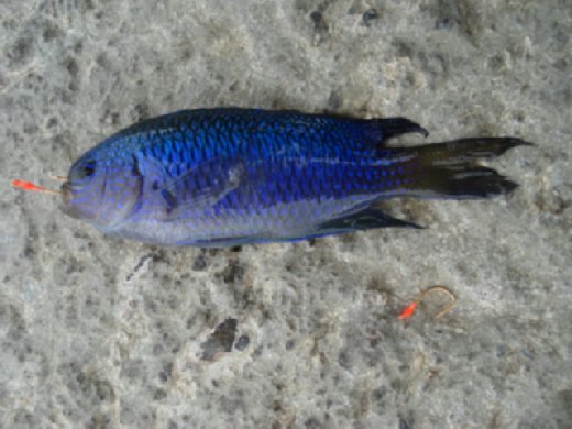 參觀完之後,大家找好了位置,就開始釣釣,因為我的是小小竿,所以只能在岸邊釣,我們原先用南極蝦釣,安有釣到,我都沒有,後來我拿出了安為我準備的祕密武器“萬能餌”(因為安跟我說過這種餌很香,所以就試看看嚕)果然一下下魚群就有來了,好好玩唷,一下餌就上勾,一下餌就上勾,就都是俗稱厚殼仔的六線豆娘魚,我真的釣到魚了,好棒唷,可惜都釣不到安釣到的藍魔鬼魚,好漂亮唷,在水裏的顏色是那種接近螢光的亮藍,一上岸就變成藍色、深藍色、紫色、黑色,好好玩唷,安在釣上第一條時我一看變成黑色的,嚇了我一大跳,後來放回水裏就又變回好漂亮的螢光藍,我好興奮,安就可憐了,一下要幫我勾餌,一下要幫我解魚、放魚,害他都不能好好釣,還要鼓勵我讓我有信心,後來我終於也釣到藍魔鬼了,我高興的都跳起來了;至於我們其他的人,朝欽也很幸運,釣的不錯,一尾道人也有釣到,只有安胖胖一隻都沒有釣到,他用的可是重裝備,看我一直拉,他就粉鬱卒,我在旁邊偷笑,真的粉好玩,後來他們看連肉腳的我都釣的到於是也用萬能餌試看看,最後連豬肉釣法都出籠了,可是沒有好像沒有什麼效果。