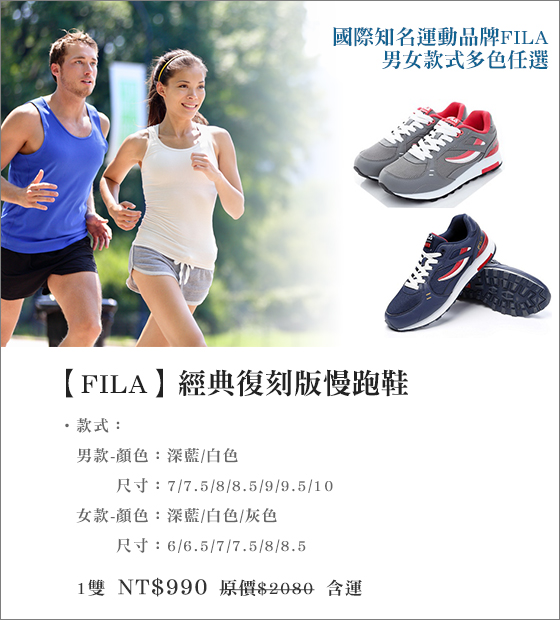商品訊息簡述: 只要990元(含運)即可購得【FILA】原價2080元經典復刻版慢跑鞋1雙,款式:男款/女款,皆有多色多尺寸可選!