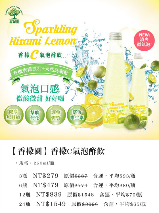 商品訊息簡述: 平均每瓶最低只要65元起(含運)即可購得【香檬園】香檬C氣泡酢飲3瓶/6瓶/12瓶/24瓶(250ml/瓶)?