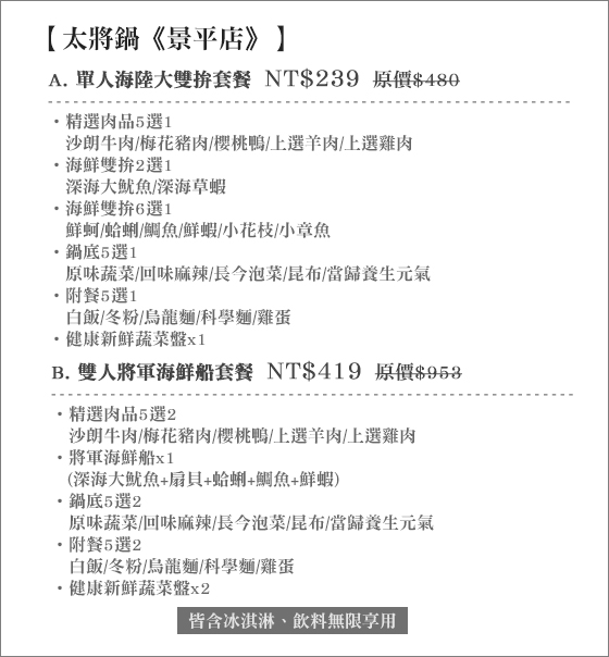 商品訊息簡述: 只要239元起即可享有【太將鍋《景平店》】原價最高953元套餐方案:(A)單人海陸大雙拚套餐:深海大魷魚/深海草蝦(2選1)+鮮蚵/蛤蜊/鯛魚/鮮蝦/小花枝/小章魚(6選1)/(B)雙人將軍海鮮船套餐:深海大魷魚+扇貝+蛤蜊+鯛魚+鮮蝦,套餐皆含:沙朗牛肉/梅花豬肉/櫻桃鴨/上選羊肉/上選雞肉(精選肉品任選)+原味蔬菜/回味麻辣/長今泡菜/昆布/當歸養生元氣(鍋底任選)+白飯/冬粉/烏龍麵/科學麵/雞蛋(附餐任選)+健康新鮮蔬菜盤+冰淇淋、飲料無限享用!。