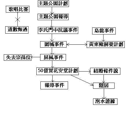 (4)李氏門中抗議事件(Hello小姐10-3集):這事件是直接在主題公園報導一掀開後,就立刻爆發的事件,是主題公園報導的對應發生的事件。也就是主題公園計劃讓齊安李氏門中的人們相當不滿,因為報紙的揭露,齊安李氏門中便跑去TOP集團舉牌抗議,李氏門中當著媒體的面前,辱罵黃萬福為偷牛賊言語,更讓黃萬福受傷,灰頭土臉,相當得難看,李氏門中抗議事件讓黃萬福的心態全然改變,從道歉轉變成全面的反擊,其影響的是: