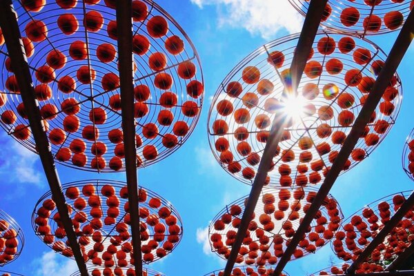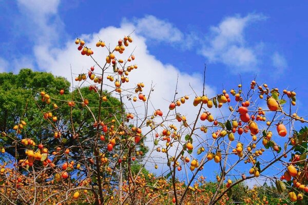 抬頭欣賞漫天金色柿子天空,