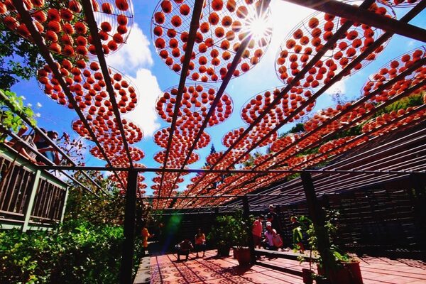 可以躲在棚架下 抬頭欣賞漫天金色柿子天空
