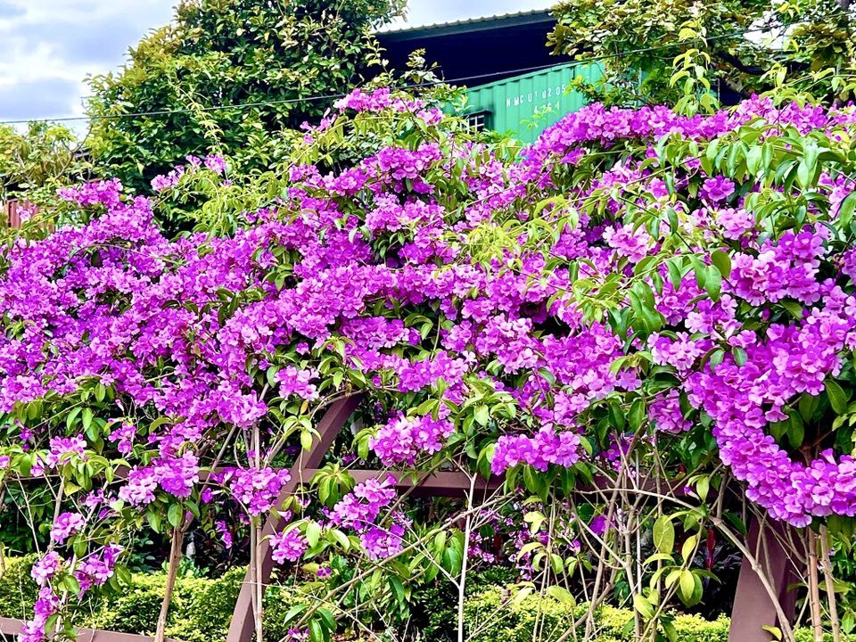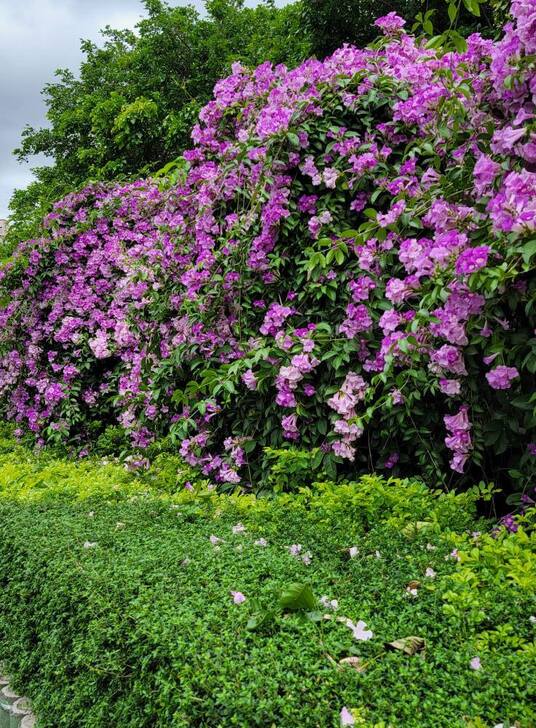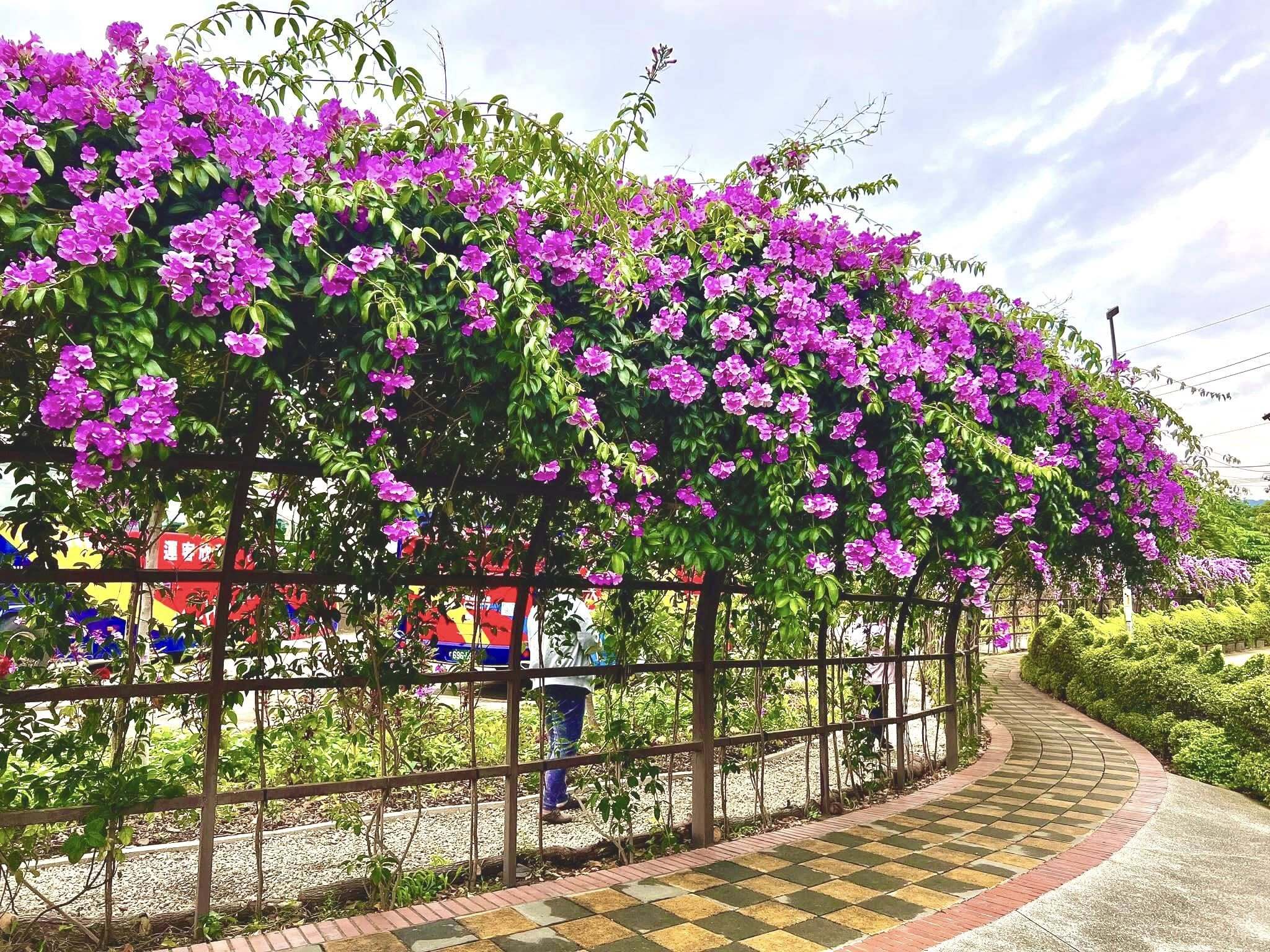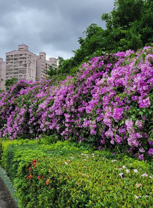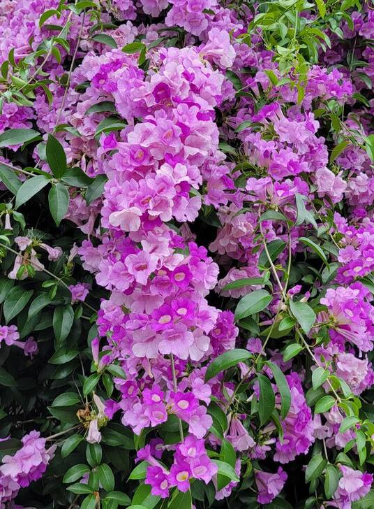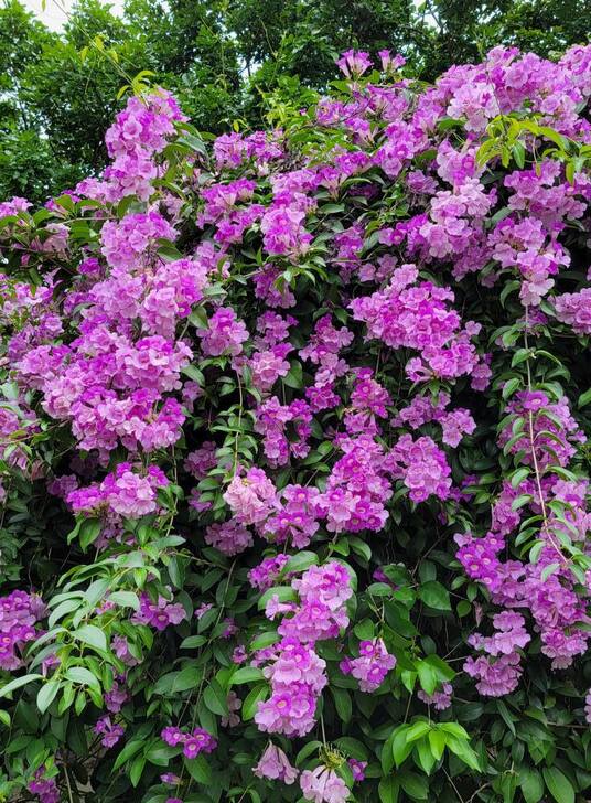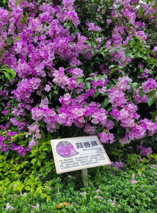 新北市泰山區,期間限定的紫色蒜香藤花海瀑布來囉!位在泰山的楓樹河濱公園的蒜香藤現還未開花。期待11月美麗的花朵隨著枝蔓傾瀉而下,猶如紫色瀑布一般,這樣夢幻的美景為期只有約7~10天!但現在就放一些6月拍的蒜香藤花。