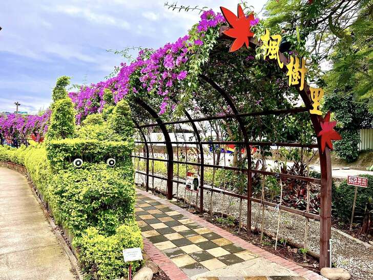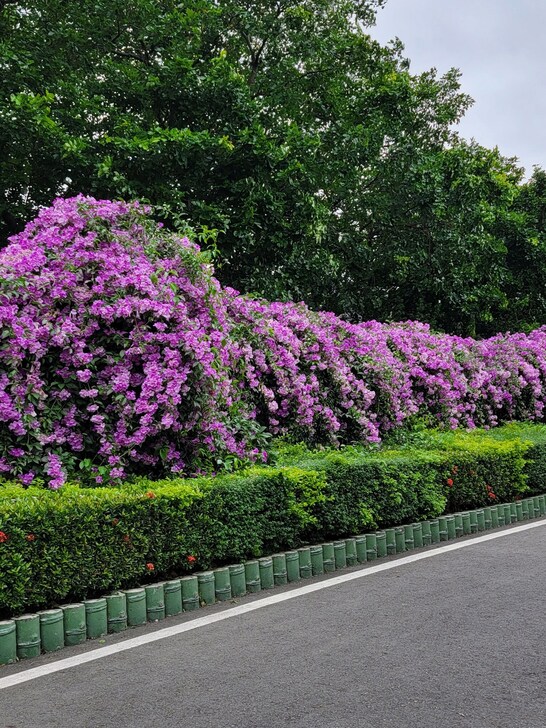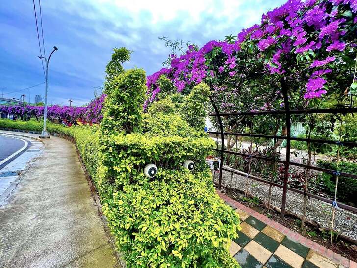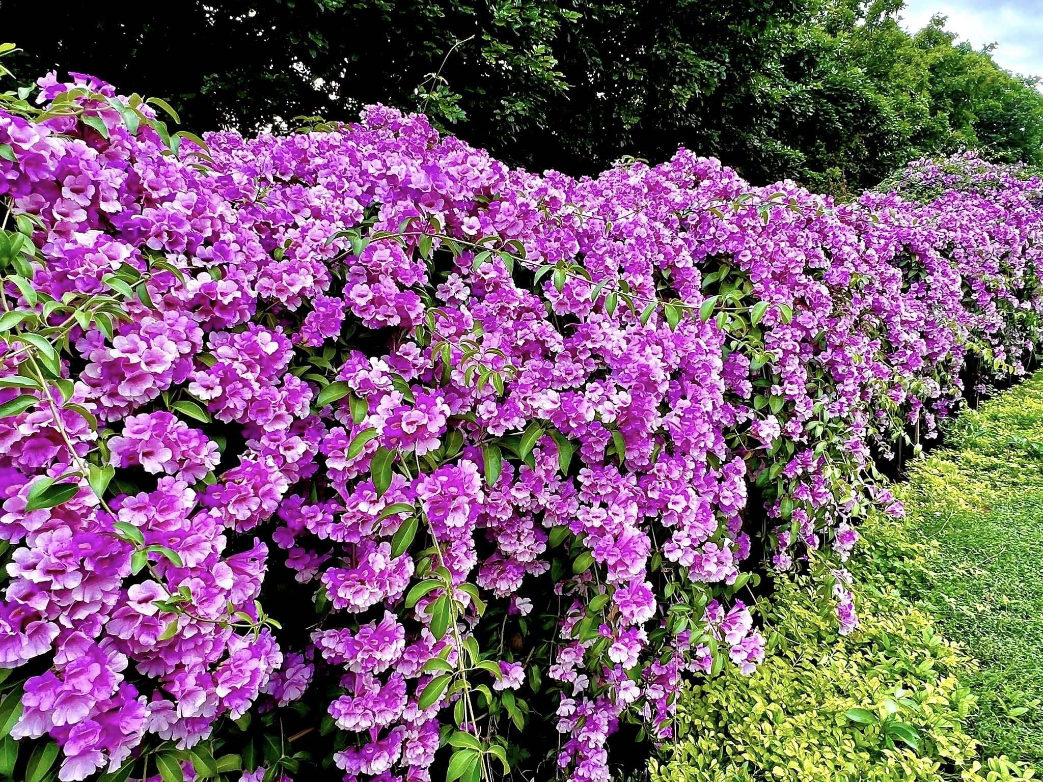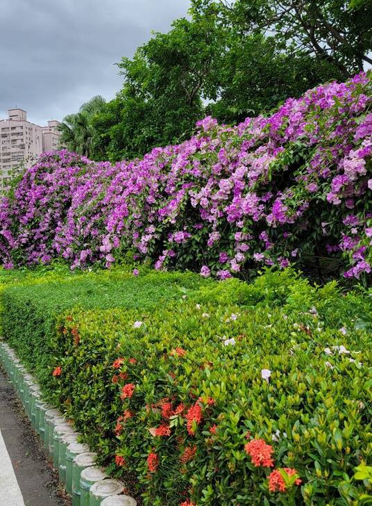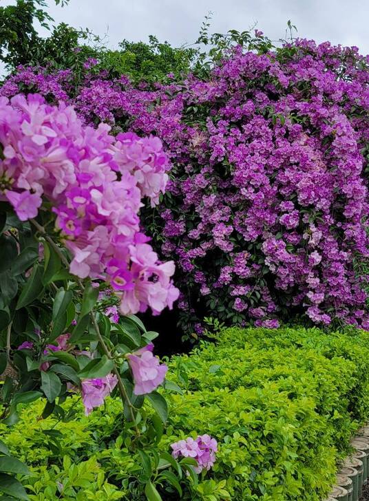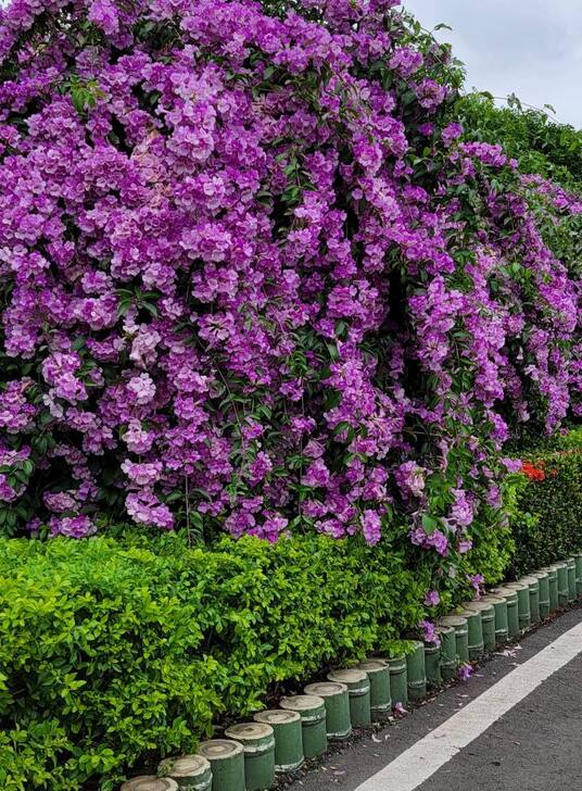 新北市泰山區,期間限定的紫色蒜香藤花海瀑布來囉!位在泰山的楓樹河濱公園的蒜香藤現還未開花。期待11月美麗的花朵隨著枝蔓傾瀉而下,猶如紫色瀑布一般,這樣夢幻的美景為期只有約7~10天!但現在就放一些6月拍的蒜香藤花。