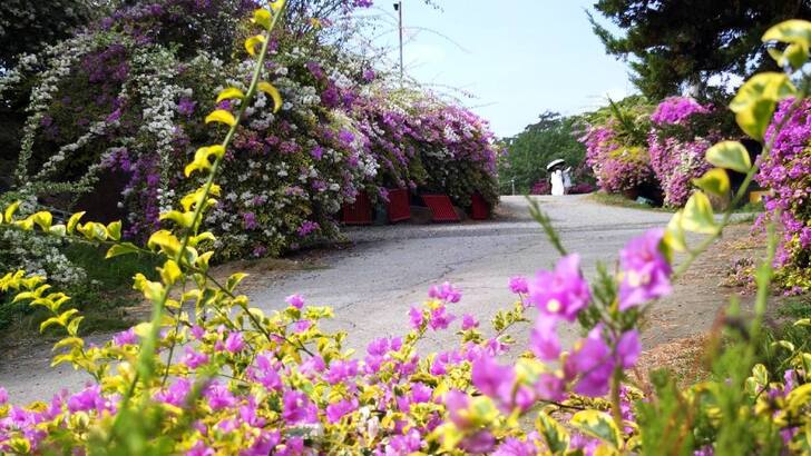 秋冬是南投最浪漫的賞花時節,竹山「黃山秘境景觀餐廳」因滿山盛開的九重葛花海爆紅。粉、紫、白三色花牆層層堆疊,隨風搖曳出繽紛的色彩,旅人漫步其中彷彿走進童話仙境。花季自每年10月起綻放至隔年1月,是南投秋冬最熱門的賞花秘境與網美拍照地。