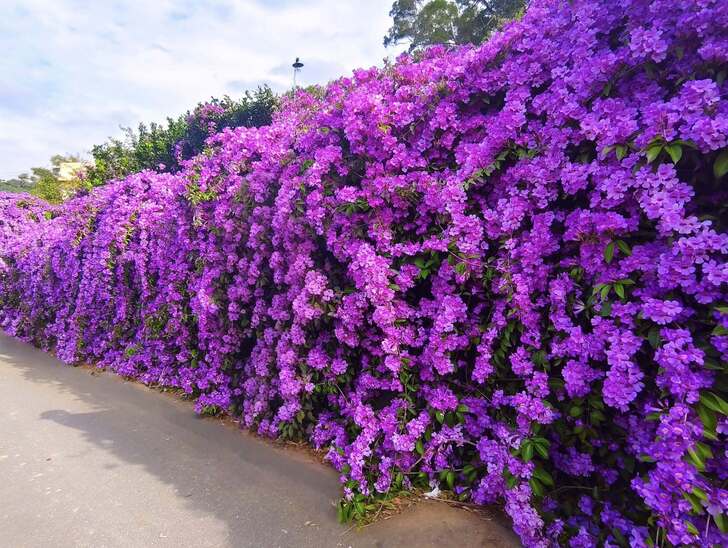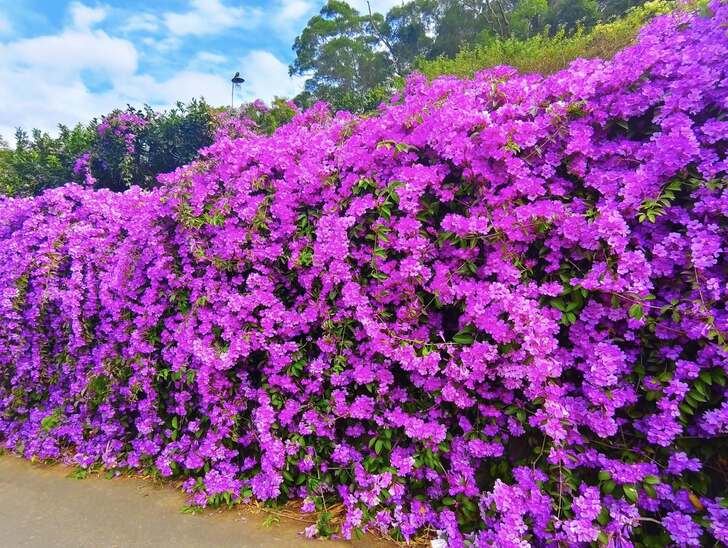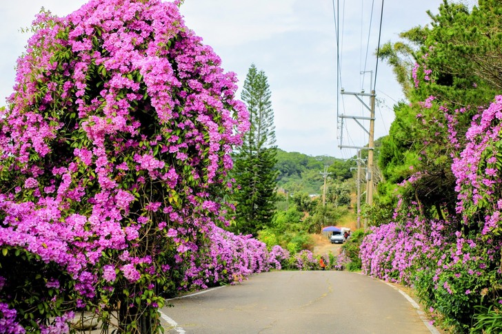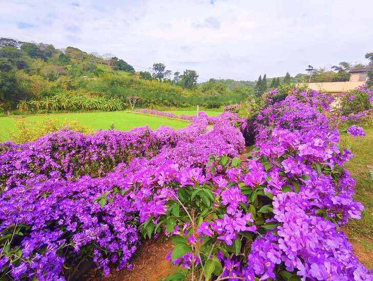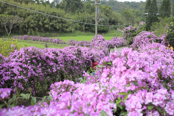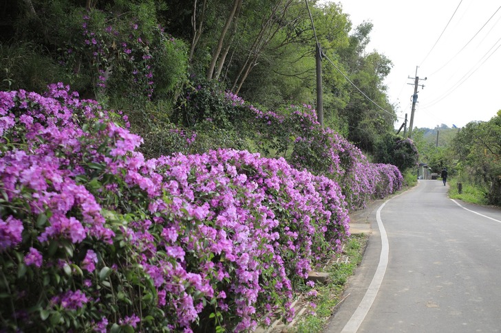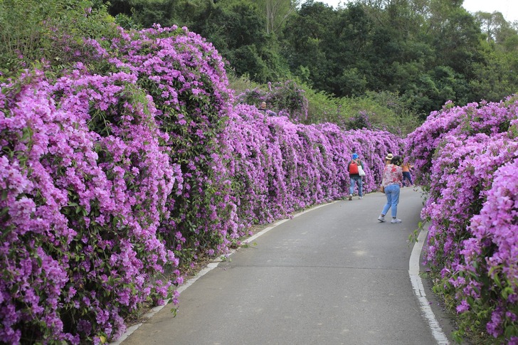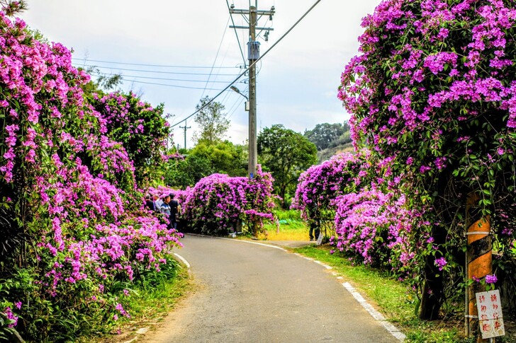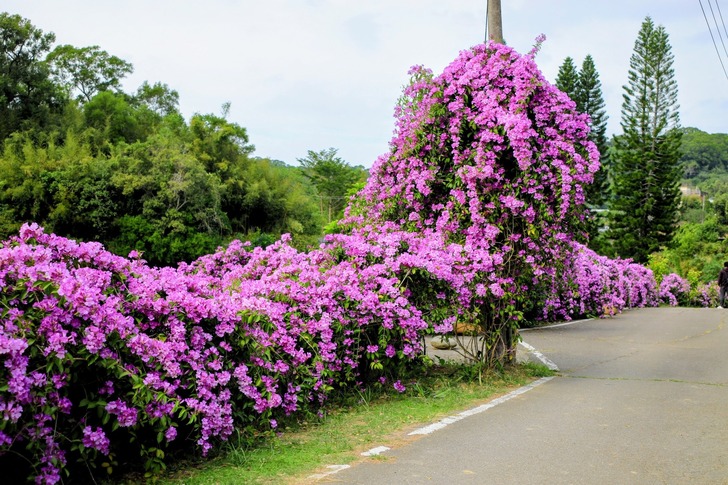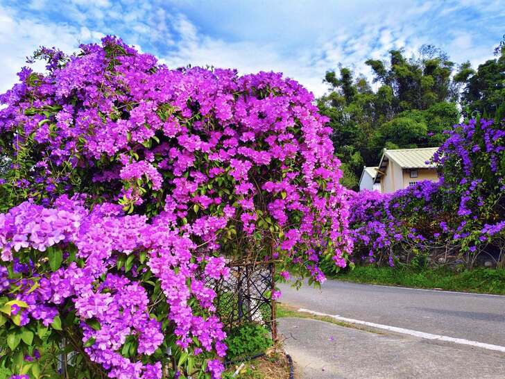 這處蒜香藤步道位在國道3號通霄交流道附近的楓樹里,為私人土地種植的蒜香藤,地主很佛心開放免費參觀,現場綿延約200公尺的蒜香藤花廊,搭配具有弧度的道路,非常適合取景。
