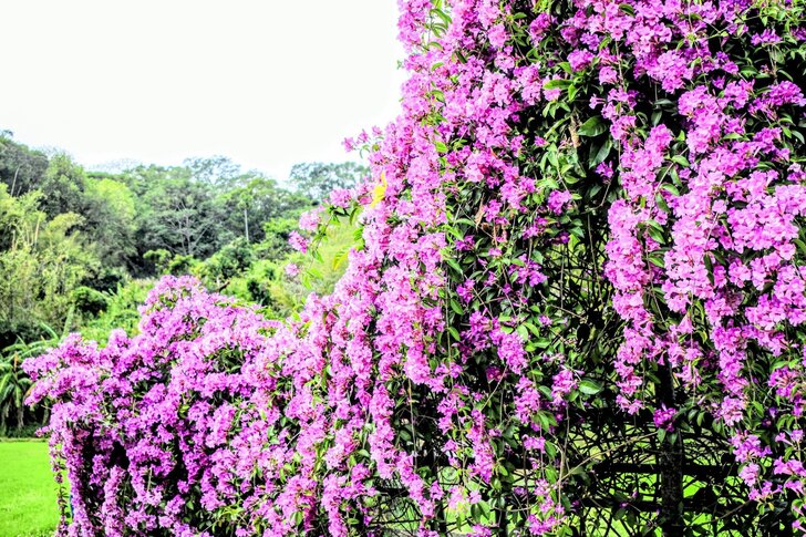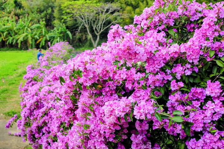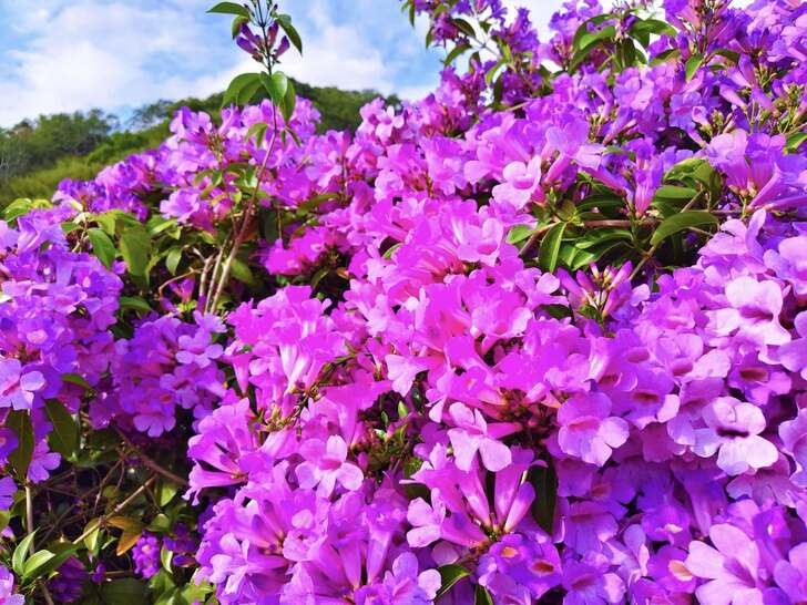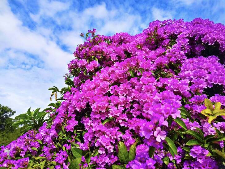 蒜香藤因花、葉搓揉聞起來有蒜香味而得名,可愛花形也被稱作「紫鈴藤」,其花期一向短暫,因此在花期來臨前就要密切注意,一旦知道開花了,要把握一週內盡快前往賞花及取景,否則只能看到蒜香藤花毯了。