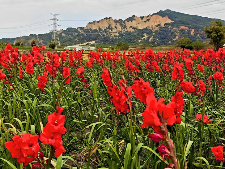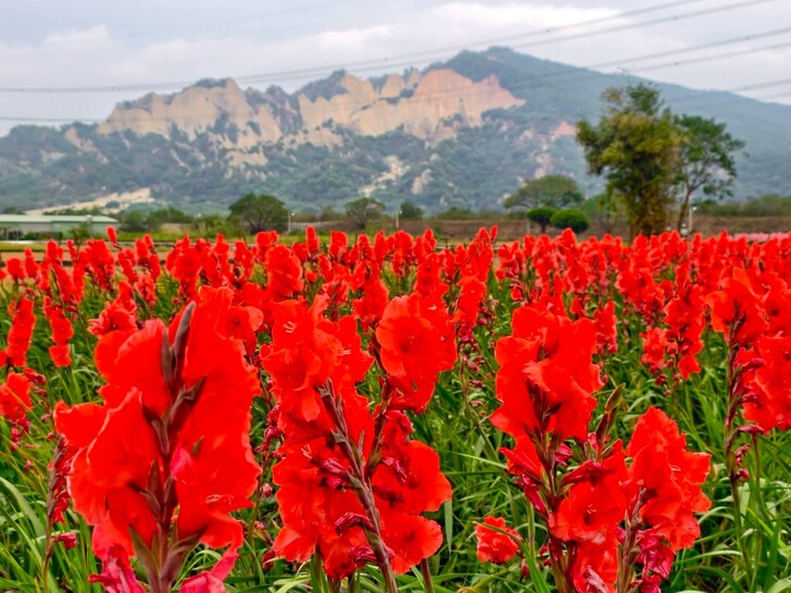 台中后里區最近突然爆紅一處「劍蘭花海」。這裡種植了大片的粉紅與雙色劍蘭,粉嫩的花瓣嬌豔欲滴,但最犯規的是,只要抓對角度,就能讓這片柔美的花海與後方氣勢磅礴、擁有特殊惡地地形的「火炎山」同框!剛硬的山勢配上柔情的花海,隨手一拍都是時尚大片,簡直美到讓人屏息。
