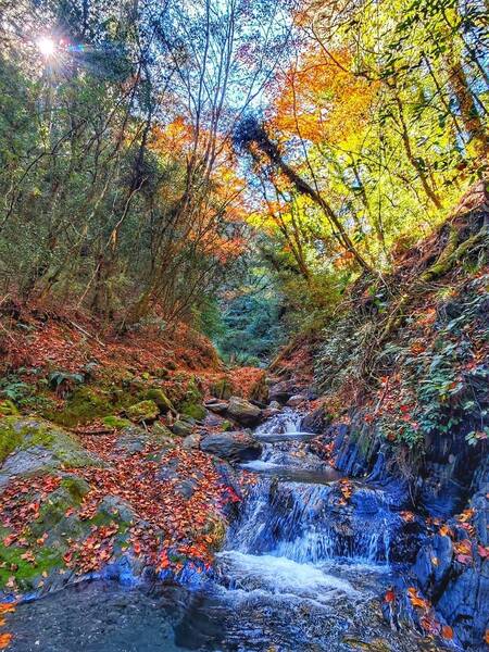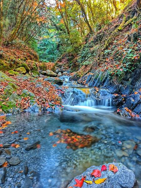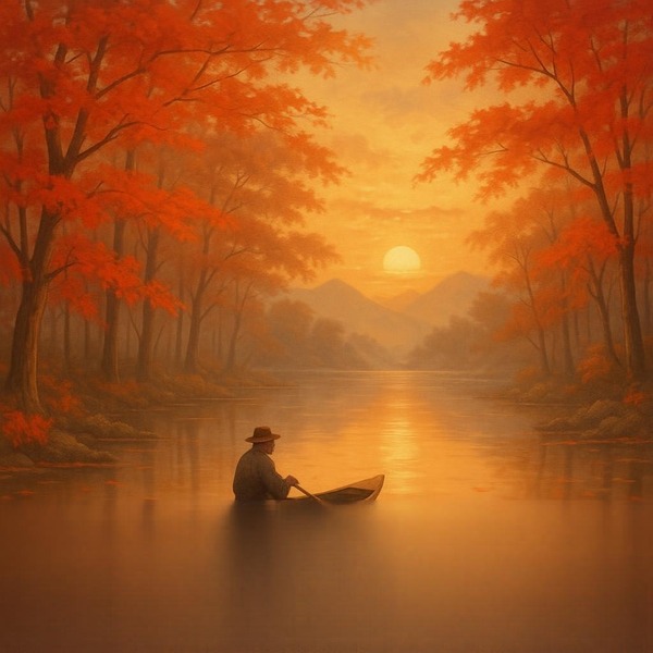 *丹楓疏林間,一艘小舟緩緩行進,夕陽灑落在水面上,如鏡般映出天光與楓影。