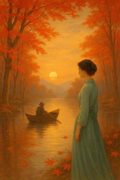 江水如練,秋風輕拂。阿嶺坐在小舟上,手握竹棹,緩緩穿過疏林。丹楓如火,映照水面,彷彿天地都染上了思念的顏色。