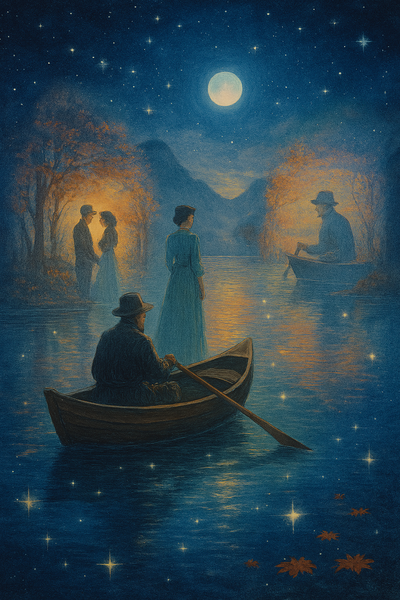 舟忽然加速,江面泛起銀光。四周景色漸漸模糊,丹楓化作星點,林影如夢。阿嶺驚訝地發現,他們正穿越一條由記憶編織的水道——每一段波光中,都映出他與芷蘭的過往:初見、相守、離別。