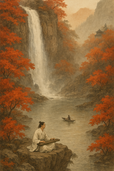 畫面中央是一道高懸的瀑布,自斷崖傾瀉而下,如碎玉飛濺。瀑布下方是蜿蜒的秋江,水面映著斜陽與丹楓的倒影。岸邊紅葉如火,風起時片片飄落,與江水交融。遠處有一座古寺,鐘聲悠悠,與瀑聲交織成秋日的樂章。畫面右下角,一位身著素衫的旅人靜坐岩石之上,手持竹簡,神情沉思。