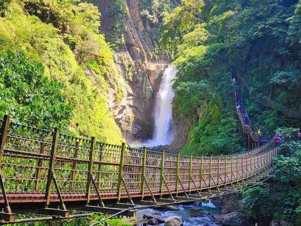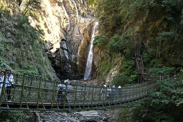 嘉義竹崎鄉「觀音瀑布風景區」「觀音瀑布風景區」因第四層瀑布溪流從山崖頂端傾洩而下,崖壁上遠觀如觀音側身而立、手持淨瓶灑水而得名。瀑布四周為群山環抱、溪谷兩岸峽谷均為峭壁,區內主要飛瀑共有4座,由高山頂峰直瀉而下,雄壯而浩大,似萬馬奔騰,懸掛於林間峽谷各成奇觀。溫馨提醒:由於前往第三層瀑布的通天坡步道因颱風嚴重毀損,目前僅開放到第二層的飄谷雨瀑布。