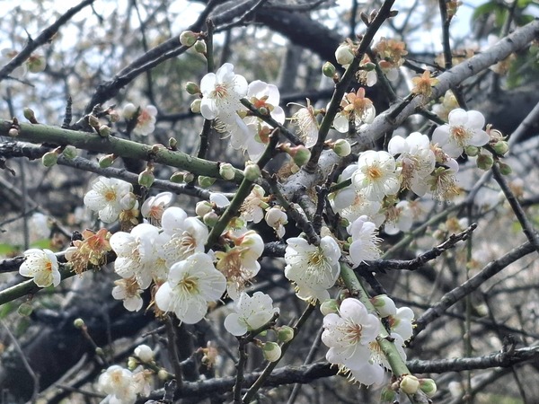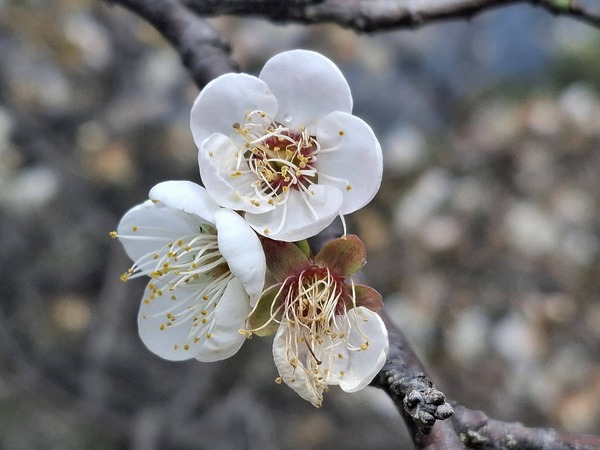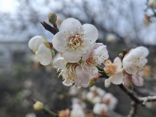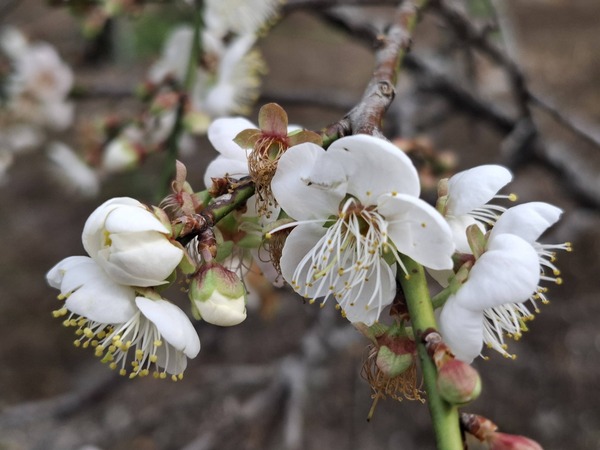 雪白的梅花越冷越開花,寒流過後,悄悄在枝頭綻放。花季剛開始,尚未有遊客,農家的小狗很是悠閒,園區中自在漫步。