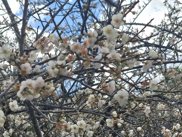 南投縣信義鄉 土場梅園 梅花盛開好美,寒流催得梅花綻放,水珠凝結花朵之間,顯得冰清玉潔。藍天下,暗香浮動,這是梅花的氣息。