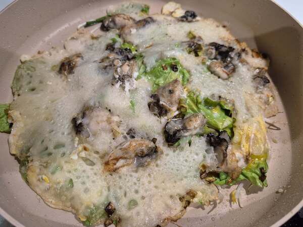 開中火熱油鍋(鍋中放一匙油),鮮蚵下鍋炒一下再淋上少許粉漿,再依序放入喜歡的青菜(我放小白菜及豆芽菜)有空的話,豆芽菜可去根、淋上蛋汁之後,也可以再淋一些粉漿(讓食材都能沾附粉漿幫助定型)。