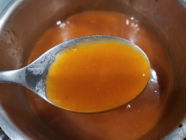 3.最後慢慢倒入太白粉水(或糯米粉水),邊倒邊攪拌,直到醬汁呈現濃稠且帶有光澤的狀態即可起鍋。(醬汁放涼後會稍微變更稠)