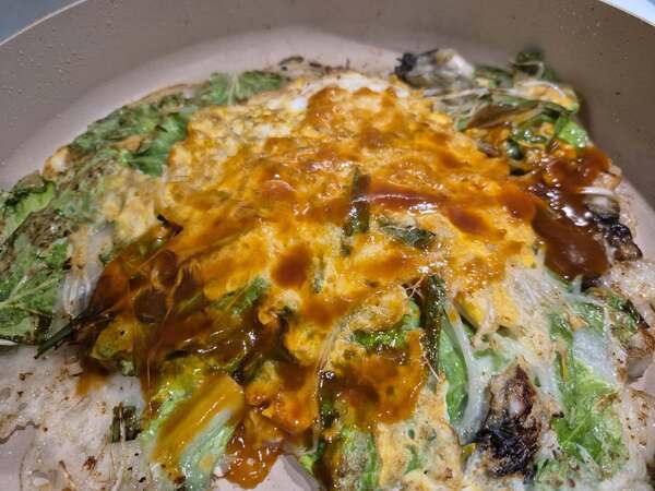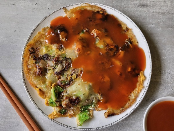 煎好的蚵仔煎可以直接淋上特製的甜辣醬汁,味道超讚喔~好吃的蚵仔煎就完成囉~