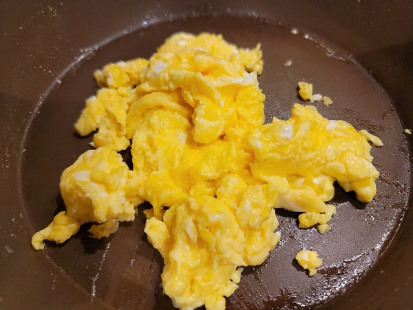 開中小火熱鍋,倒入一大匙食用油潤鍋,蛋汁下鍋炒至半生熟(滑嫩口感)即可準備起鍋、備用。