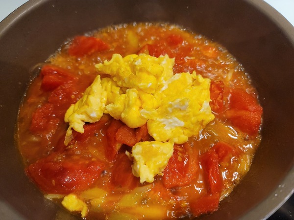 再加入嫩蛋稍微拌炒(嫩蛋可以用鍋鏟稍微拌成小塊),如果湯汁喜歡濃稠一些,也可以加一點太白粉水勾薄芡(完熟的蕃茄就不須再勾芡,湯汁就非常濃稠)。