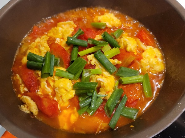 蕃茄炒蛋這道菜大家是先炒蛋還是先炒蕃茄呢。熄火前加入蔥綠拌炒一下。