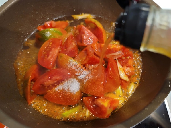 沿用原鍋,加入少許的食用油,蔥白下鍋拌炒出香氣,轉中火,再加入蕃茄塊炒至出沙(蕃茄經過油炒加熱後會釋出大量茄紅素)。