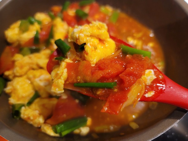 我喜歡嫩蛋吸附蕃茄醬汁的美味口感,完熟的蕃茄炒出的蕃茄炒蛋好紅喔。