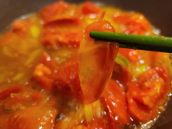 煮至蕃茄軟了即可開蓋,用筷子取出蕃茄皮(少了蕃茄皮這樣口感更好)。