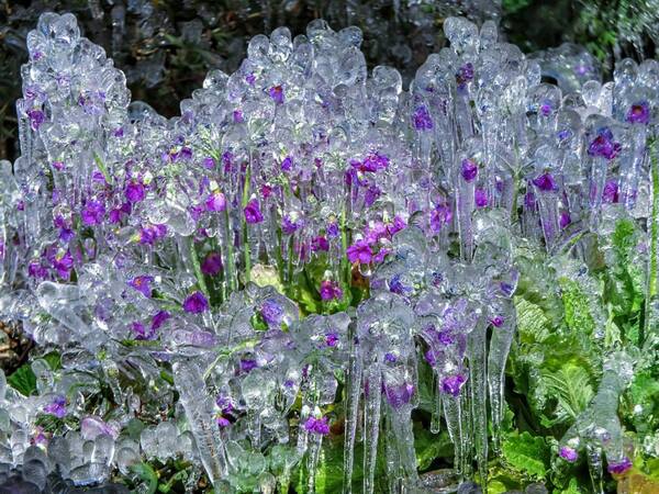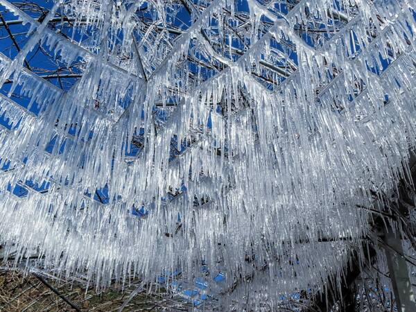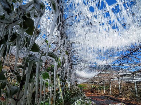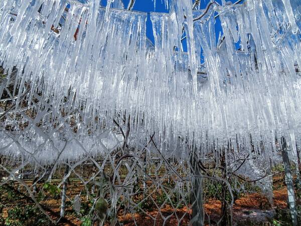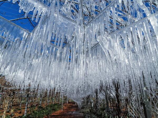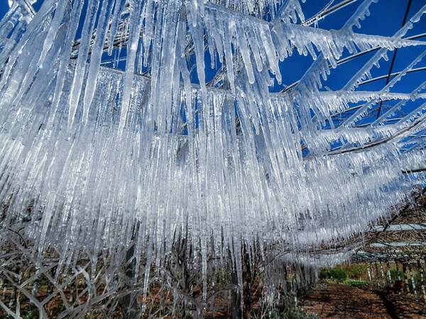 武陵農場今天清晨氣溫再下探,也讓園區出現獨特冬日風景,藤花園內長長的藤架掛上一整排透明銀白冰柱,讓旅客宛如走在冰晶隧道間。一旁的樹枝、小花也被霜凍封存,彷彿一件件藝術品般。