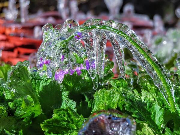 走進藤花園,只見冰柱如水晶簾幕般自棚架垂落,在晨光映照下折射出剔透光澤,層層交錯宛如天然打造的藝術裝置。花草枝葉被霜凍輕覆,線條定格於寒冬瞬間,形成如夢似幻的「冰柱捕夢網」,讓人不自覺放慢腳步,細細感受自然的靜謐與純粹。