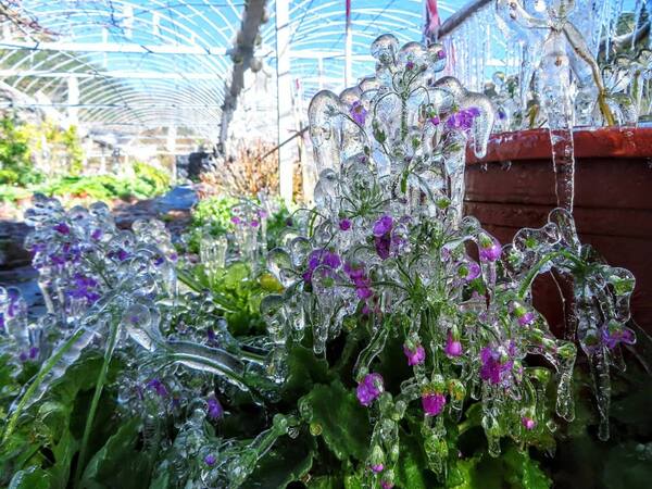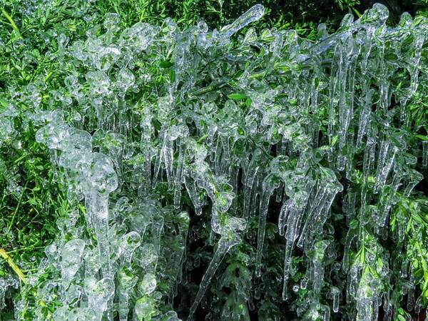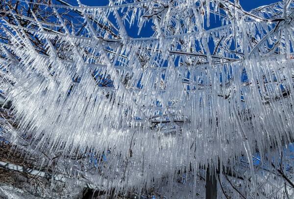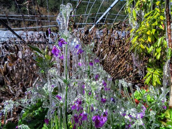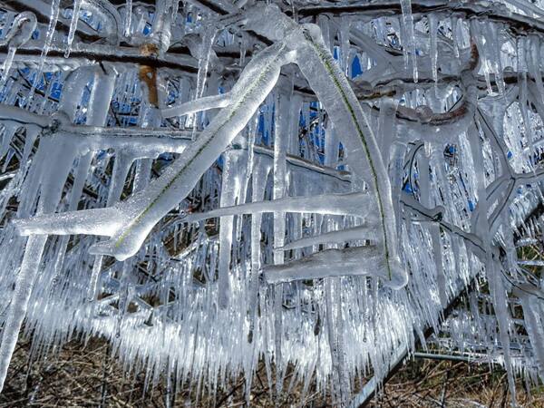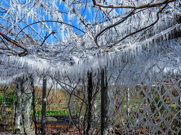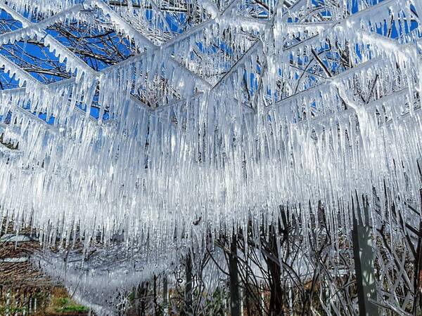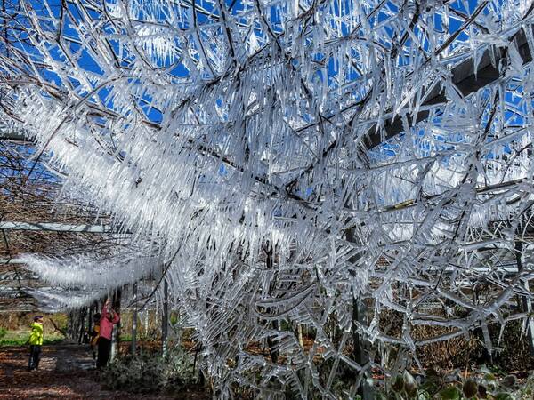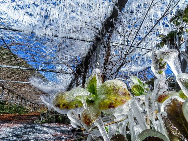 ▲▼藤花園的藤架與樹枝都出現冰柱。