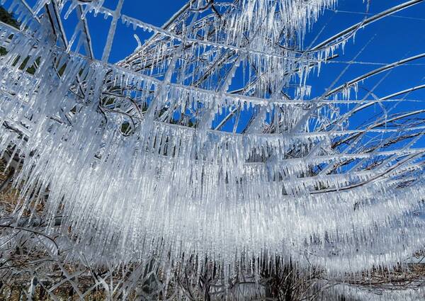 強烈大陸冷氣團來襲,台灣多處高海拔地區均變成銀白世界。武陵農場(3日)清晨氣溫零下1.2度,讓藤花園再次變成夢幻冰晶宮,冰柱如簾垂掛,景色如夢似幻,吸引許多旅客欣賞。