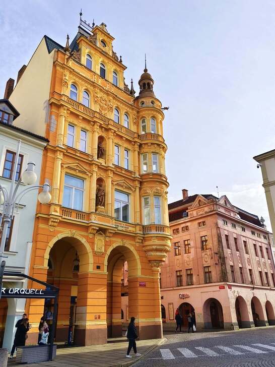 ▲ 前方金色的建築就位於巴德傑維契的廣場,金黃色建築的一樓是個匯兌比例不錯的地方。如果有匯兌的需要,可以考慮這個地方。