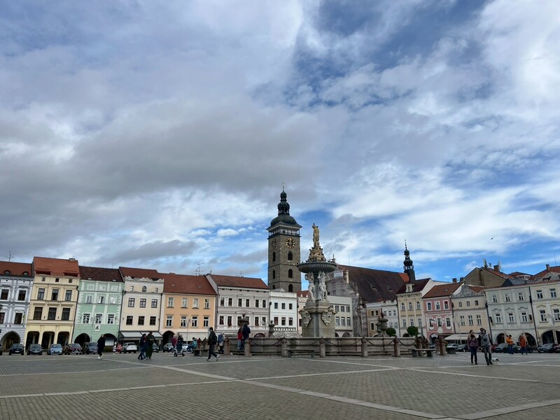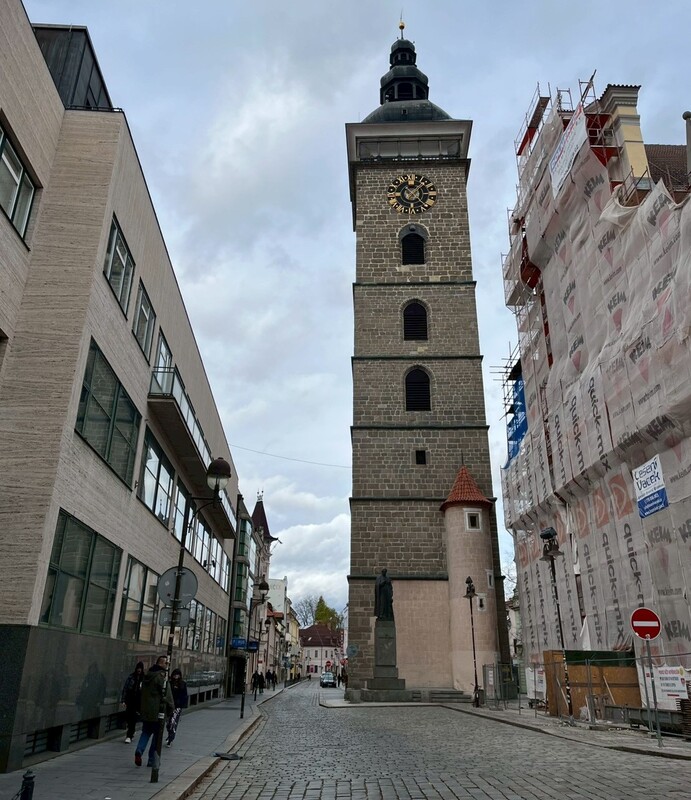 圖中可以看到CB有名的黑塔,當天風大冷冽到我們連走過去都懶,更沒有登塔眺望城市。塔內有5個大鍾,聽說每天在城裡都能聽到鐘聲,不過我還真沒印象呢!其實在 Český Budejovice 的遺憾實在太多,沒有參觀百威酒廠、刺蝟筆工廠、南波希米亞博物館、CB近郊的Hluboká城堡、城市裡的各種美麗房子與教堂……若非當初只安排停留不到一天 (而且大部分時間都躲在轉運站的MALL購物哈),我想這個城市比原本以為的更耐玩。