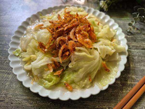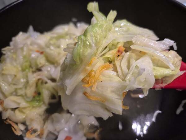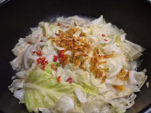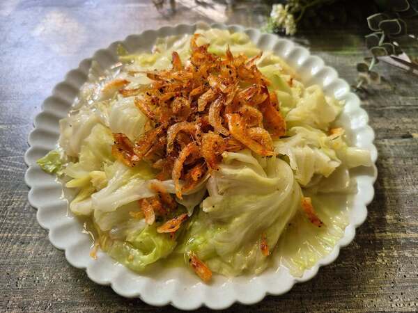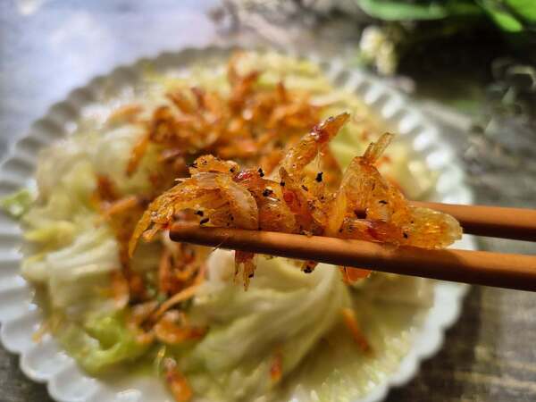 我喜歡將一部分的櫻花蝦最後放在高麗菜上,不只好看又能吃到酥脆口感。