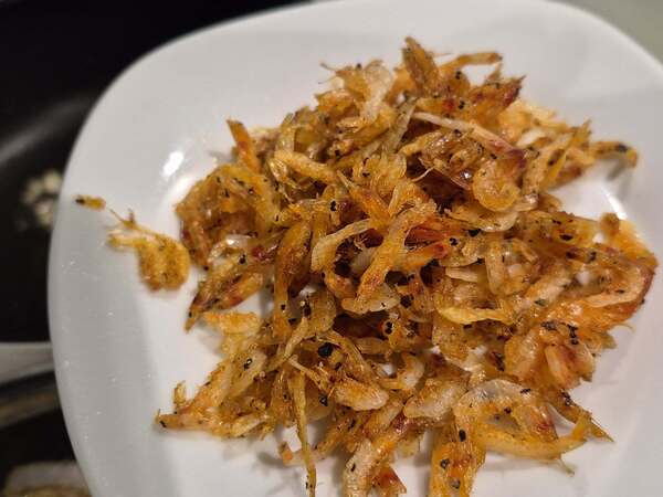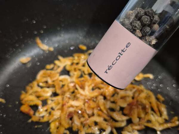 開中小火,炒鍋倒入少許的食用油,將櫻花蝦下鍋炒至金黃、香氣出來,灑上少許的黑胡椒粉。