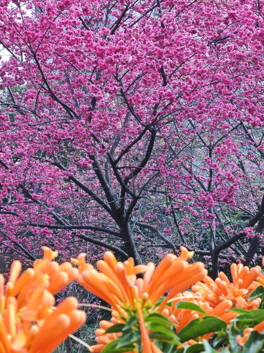 春天悄悄報到,新北市鶯歌區永吉公園也迎來一年中最繽紛的時節。永吉公園內籃球場後方的山櫻率先登場,緊接著橙紅亮眼的炮仗花接力綻放,為園區鋪展出一幅春季限定的繁花美景。永吉公園春季花季已正式啟動,從即日起一路延續至三、四月,邀請民眾把握花期,走進公園感受春日氣息。隨著氣溫回暖,永吉公園內的櫻花也將陸續登場,從二月起山櫻花率先綻放,接續的墨染櫻展現淡雅花姿,粉白花朵點綴步道與草地,隨風搖曳,讓整座公園瀰漫浪漫春意。無論是近距離拍攝花朵細節,或漫步園區取景,都能輕鬆拍出充滿春天氛圍的美照。