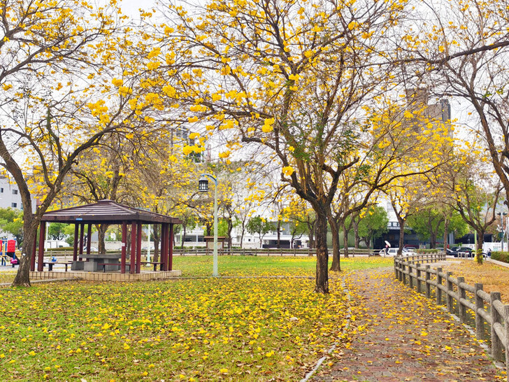 面積約5公頃的廍子公園是台中北屯區排名前幾大的公園之一,除了有廁所、涼亭、各式小朋友的遊具,最吸引人的莫過於一棵棵高聳的黃花風鈴木,由於種植面積夠廣,讓公園裡也有金色天花板。