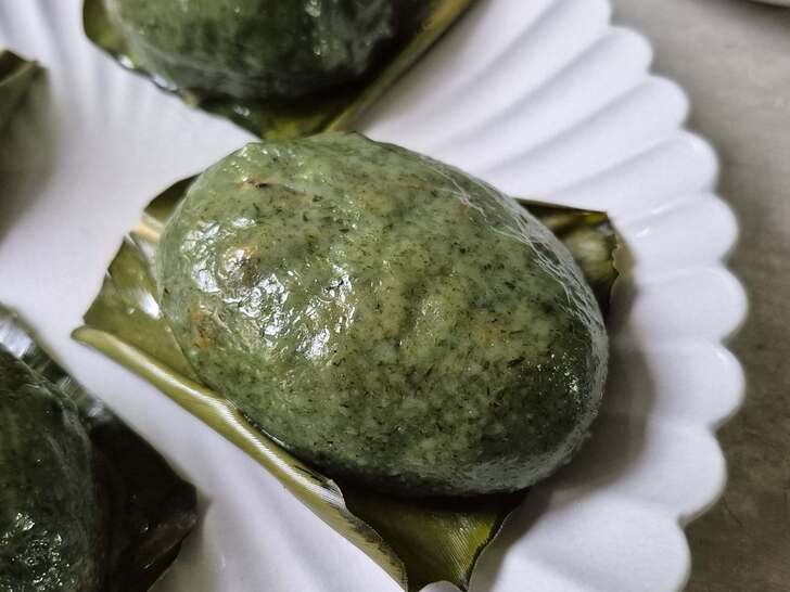用鮮嫩的艾草來做粿皮,再使用月桃葉鋪底,這樣蒸出的草仔粿真的很香。
