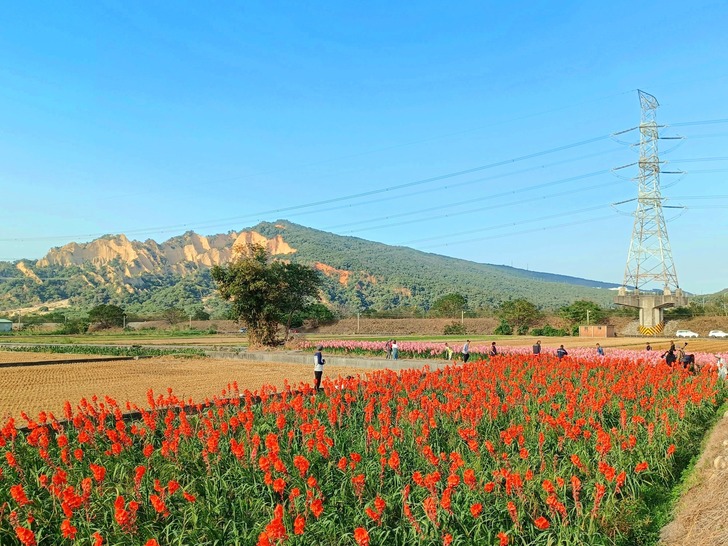 位於中社花海北1公里,台13舆土城交叉處,停車停於台13橋下,或是停於道路較宽路邊,主人佛心來的不收門票,可買便宜莱及花。 2025.12.04 台中市后里區“火炎山劍蘭花海”,位於台中后里區的「火炎...