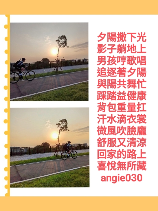 (小聲說: 那騎腳踏車的飛快! 比落日比妳移動的都快! 呵~很有張力呀!)您好