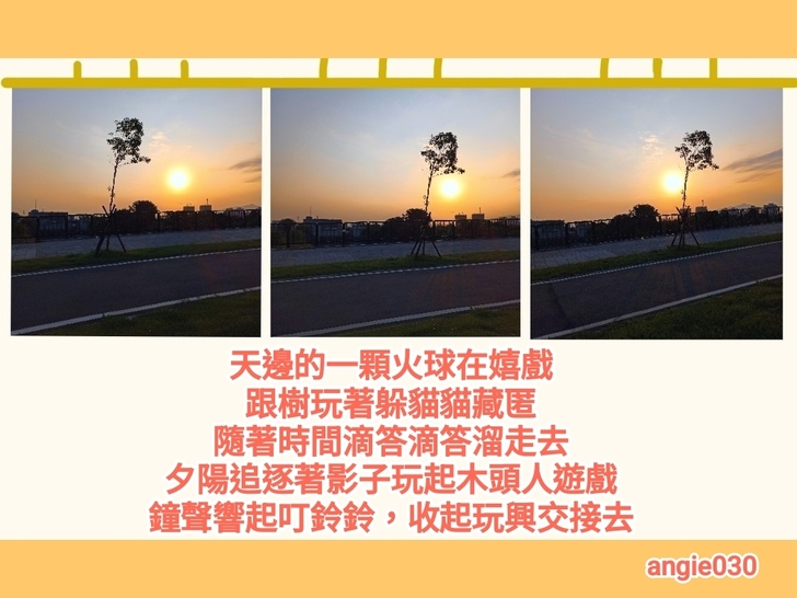 angie 好! 真喜歡那落日與樹與行駛中的妳的相對連續拍。寫得何其生動啊!