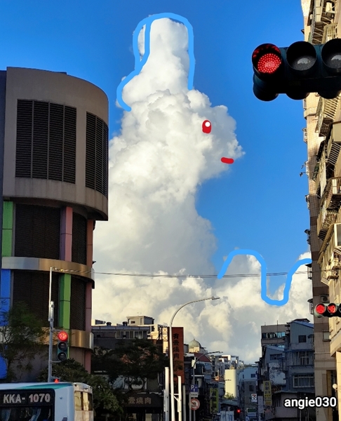 高樓大廈中間開道,藍天裡隱藏著一隻巨大的兔子,你看見兔子的嘴巴在哪裡?請發揮想像力,試著啊把線條加進去,不知你看的可是白兔身影,亦是別種動物的行跡?這潔白色的雲層裡,是否透露這些訊息,是傑克與魔豆故事中的樓梯?又或許是風的督促恰巧聚集在一起。作品「雲來了」